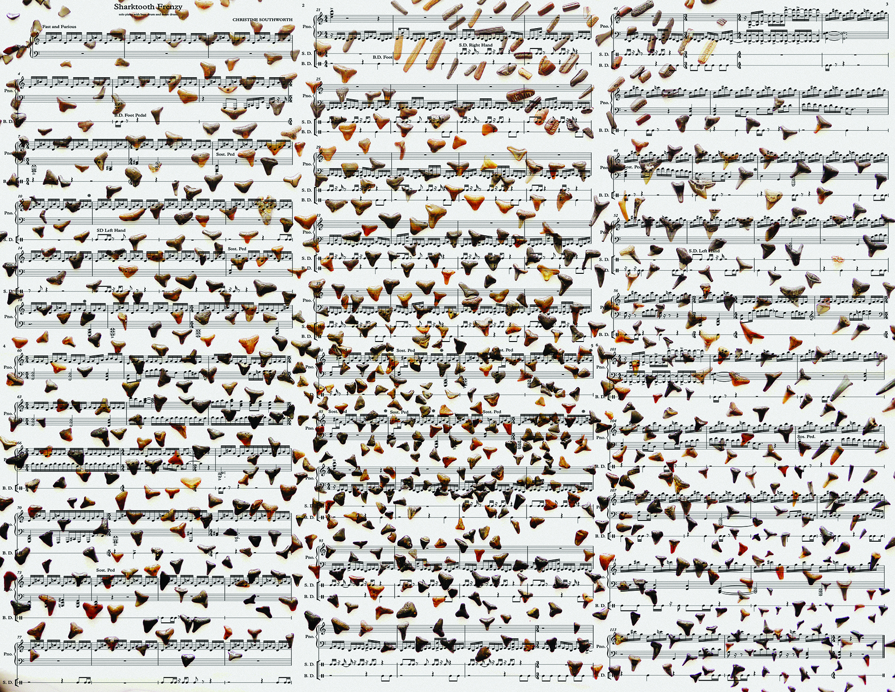 For Danny Holt, solo pianist with snare drum and bass drum. Composed at The Hermitage Artist Retreat. I wrote Sharktooth Frenzy for Danny Holt in January 2014, while in residence at The Hermitage Artist Retreat in Manasota Key, Florida, a special place, paleotologically, because fossilized shark teeth from up to 50 million years ago wash up on the beach here every day. Around 50 million years ago, Florida was completely under the ocean, and layers of limestone accumulated to create the bed rock of Florida. Starting around 30 million years ago, as the Earth cooled, sea levels dropped and Orange Island emerged in what is now north central Florida. 10 million years later, in the Miocene period, tectonic activity forced uplift around Orange Island and Florida began to resemble the land mass it is today. The coastal area was still covered by a shallow sea, but land animals lived inland. Further north the Appalachian Mountains were forming and sediment was flowing into Florida making very nutrient rich waters, which sank to the bottom of these shallow seas entombing dead marine animals and teeth from sharks (sharks loose teeth frequently, going through up to 30,000 in their lives). This continued until around 5 million years ago. There is an abundance of these fossilized teeth and other bones in the Peace River Formation and Myakka River, which washes out into the gulf each day, and then subsequently the fossils wash up onto the beaches of Manasota Key and Venice Beach. So while I was composing this piece for Danny, I was also obsessively collecting shark teeth. I’d go out each day as the tide was retracting and collect hundreds, actually thousands, of teeth. And it was a bit of a frenzy. So I decided this piece had to be about this process, collecting as many teeth as I could find and coming back to write music!
