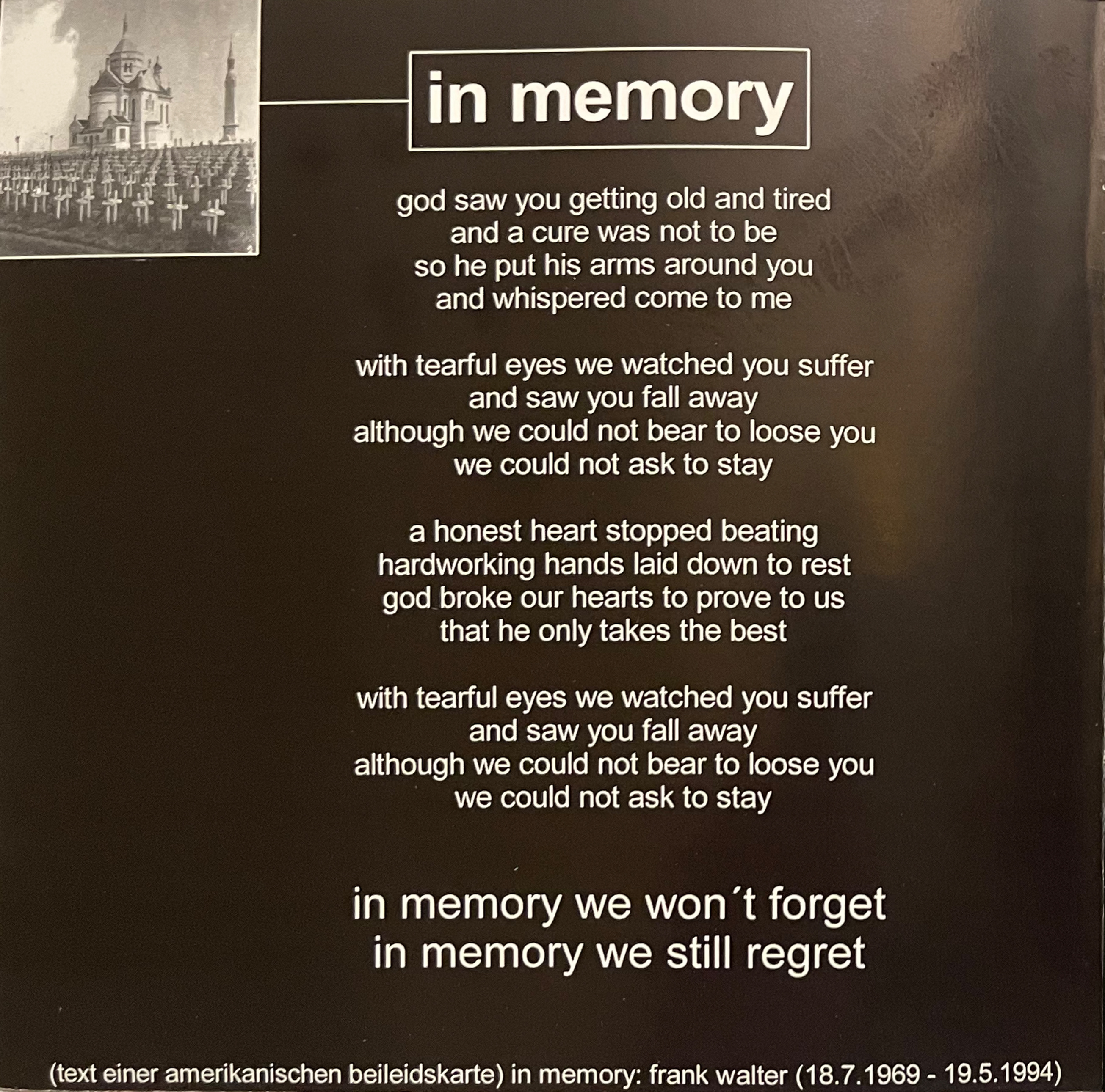 In memory of Frank Walter (18.7.1969 - 19.5.1994)
