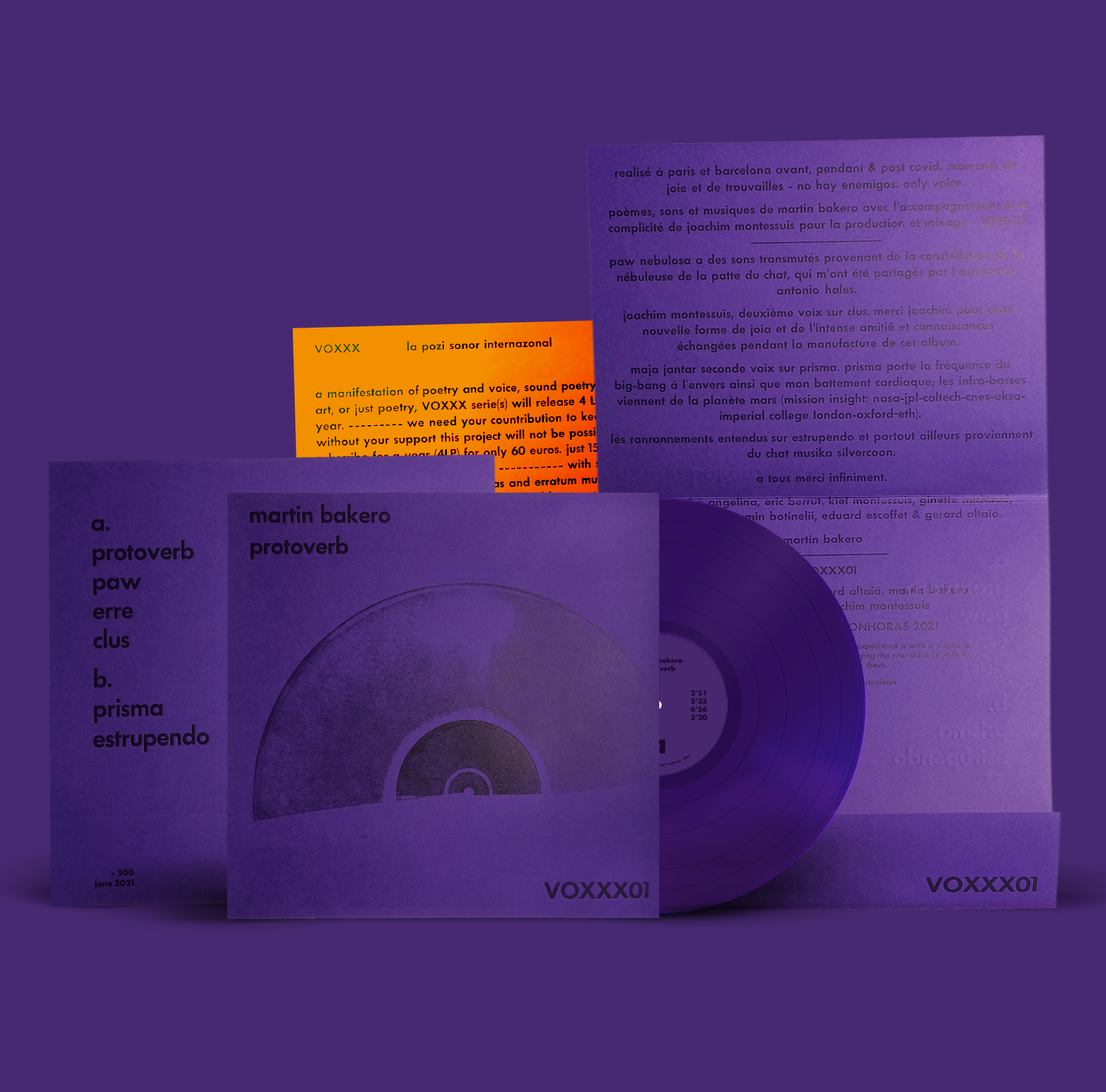 This is the first release of the VOXXX series, a sound poetry magazine with 4 LP releases each year. A manifestation of poetry and voice, sound poetry or vocal art. A joined adventure by Erratum Musical (Paris) and Sonhoras (Barcelona). Precious cut and sound edition, along with beautiful artisan work made by hand in letterpress print.