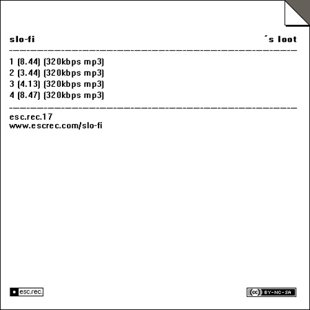The final MP3 by Esc Rec (for the moment), is by slo-fi, the techno project of one Roel Meelkop, who in another life is known as Roel Meelkop, the serious composer of microsound, silence and such like. But rhythmical always had a strong interest to him. See his involvement with Goem, with Zebra and solo as slo-fi. The project that is probably the easiest to access is also the project that brought him the least fame. He has two old 12" releases on Audio.NL, one of Antenne Records and some CDR release, and here four tracks that could have been a great 12". But it hasn’t been. If that is a great pity is not for me to tell: I am not a DJ of any kind, so the medium in which things take shape is always of least interest to me. But I can imagine that this would sound really fine on 12", when cut right, and that a fine DJ would spin this in front of a dancing crowd. That would in a world of justice, but there is no such world. I think slo-fi makes great dance music, even for those who hardly move their feet, like me. It’s a pity that this side of Meelkop’s career never took off and he is not ranked as important as he is in that area. Shame shame. But now you can take it for free and see what you missed.