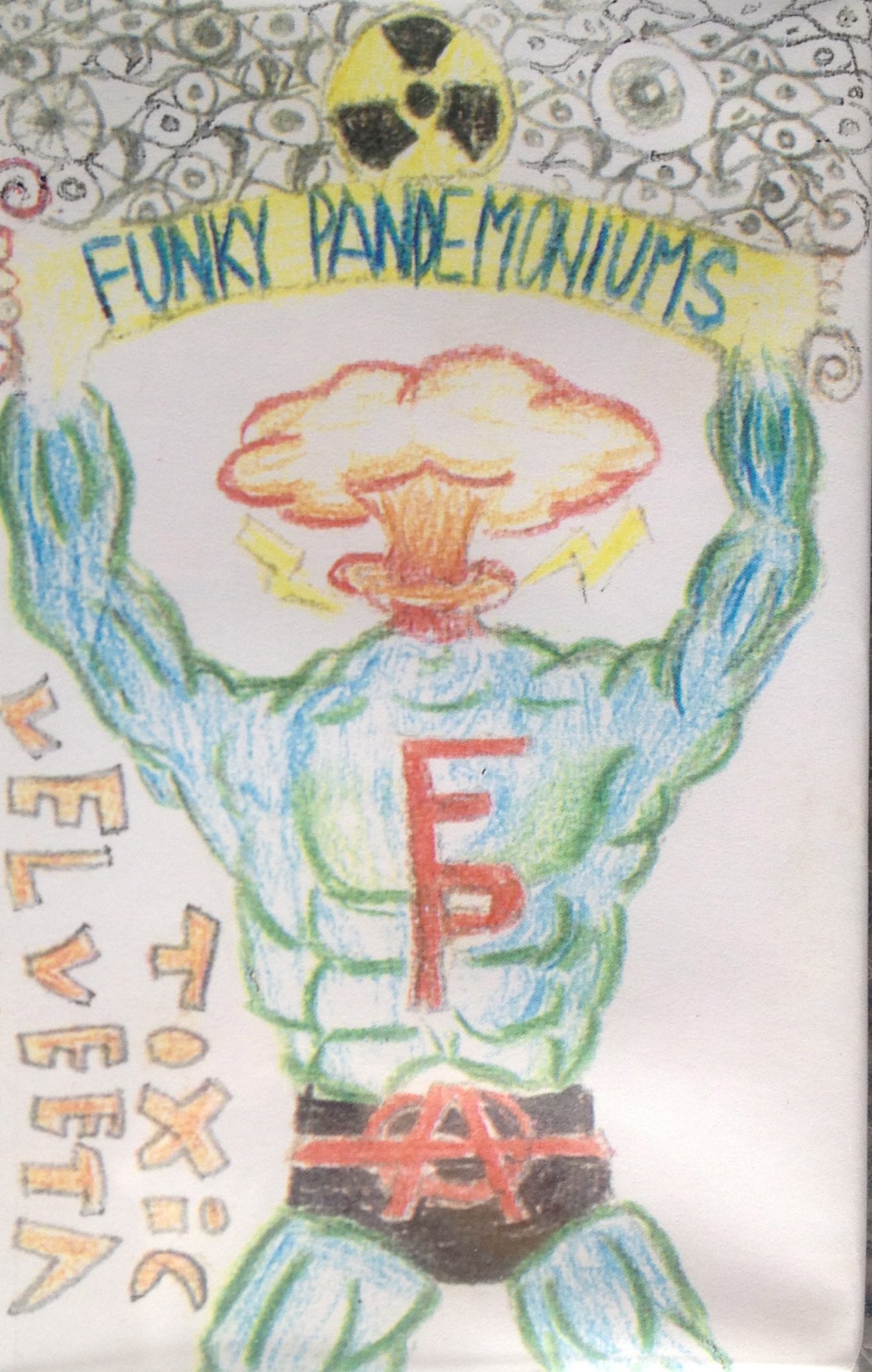 FT004 FUNKY PANDEMONIUMS "Toxic Velveeta" cassette. Punk, rap? madness circa 1988. These kids just didn't give a fuck and created music only they could have. After opening for Old Skull on a US tour about half way through the tour the Michigan Funky's quit the tour because the other band were a bunch of shit head kid assholes. Hand numbered edition of 11.