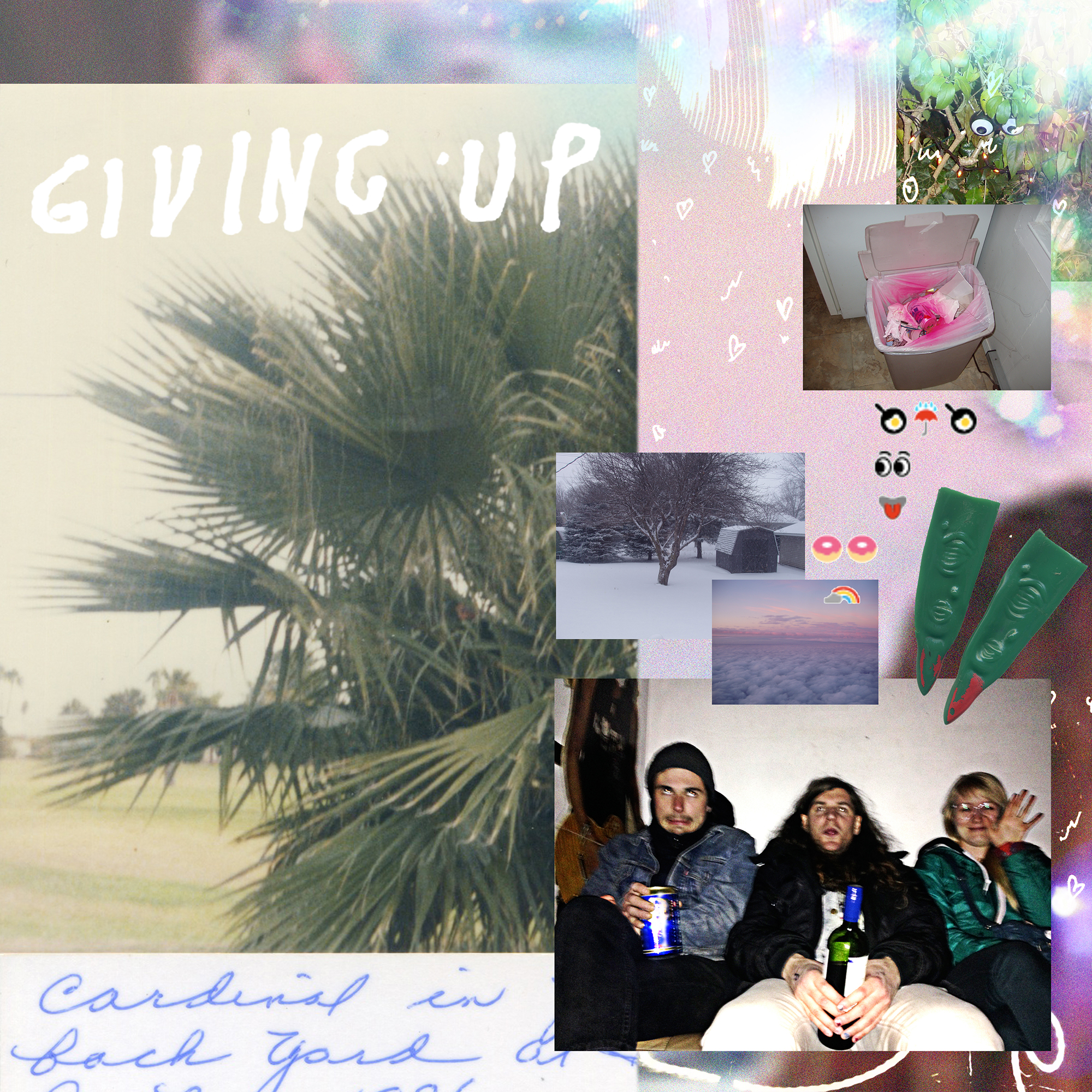 Garner Cardinals is both littered with and colored by images of Giving Up's own little America – an unknowingly large yet strangely intimate midwestern wasteland layered with spray-painted alters, misoriented gravestones, natural beauty, body dysmorphia, hamburger sunsets, small-town bad news, battery-operated memories, haunted mansions, shameless fantasies, forever-friendships, and an ultimate sacrifice of going deaf for what they love.
