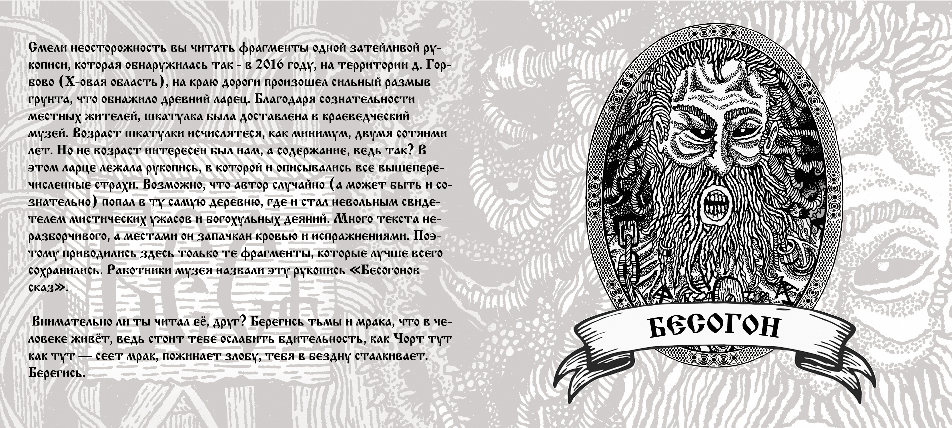 Смели неосторожность вы читать фрагменты одной затейливой рукописи, которая обнаружилась так - в 2016 году, на территории д. Горбово (Х-овая область), на краю дороги произошел сильный размыв грунта, что обнажило древний ларец. Благодаря сознательности местных жителей, шкатулка была доставлена в краеведческий музей. Возраст шкатулки исчислятеся, как минимум, двумя сотянми лет. Но не возраст интересен был нам, а содержание, ведь так? В этом ларце лежала рукопись, в которой и описывались все вышеперечисленные страхи. Возможно, что автор случайно (а может быть и сознательно) попал в ту самую деревню, где и стал невольным свидетелем мистических ужасов и богохульных деяний. Много текста неразборчивого, а местами он запачкан кровью и испражнениями. Поэтому приводились здесь только те фрагменты, которые лучше всего сохранились. Работники музея назвали эту рукопись «Бесогонов сказ».