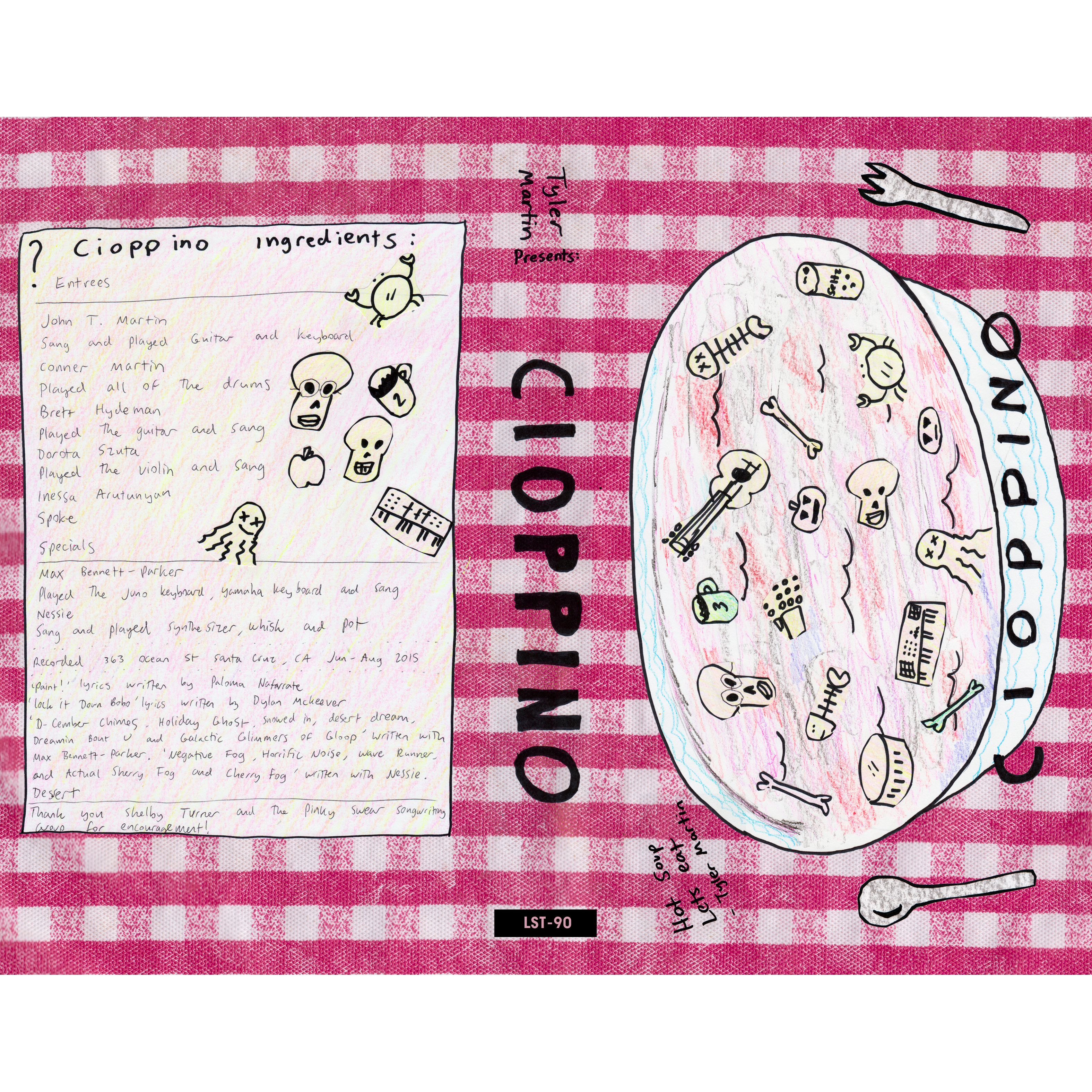 This one of a kind album cannot be contained by one, nor by two, nor by three cassette tapes. "Cioppino" is a 4 cassette album that comes in VHS style packaging with wrap around artwork by Tyler Martin himself. A very limited edition of 50 solid "rubine red" cassette tapes with hand stamped labels to match the red and white picnic placemat motif.