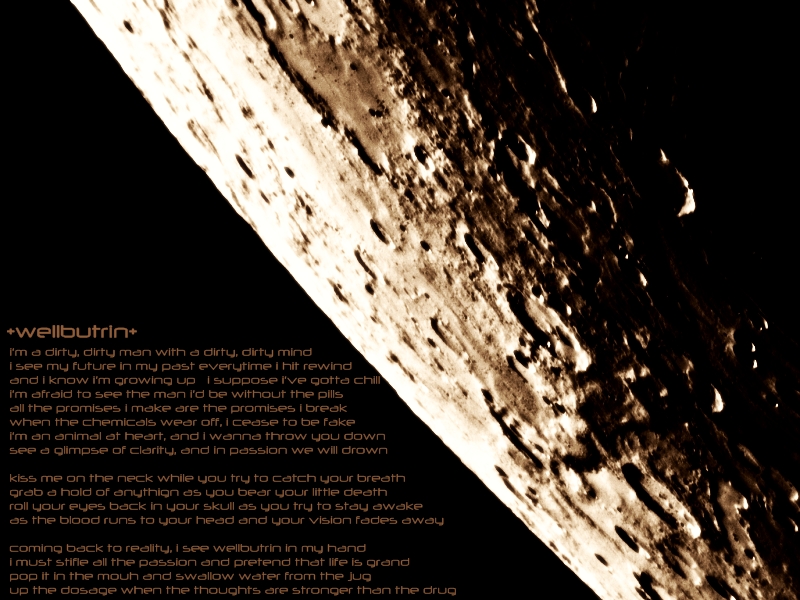 coming back to reality, i see wellbutrin in my hand i must stifle all the passion and pretend that life is grand pop it in the mouh and swallow water from the jug up the dosage when the thoughts are stronger than the drug