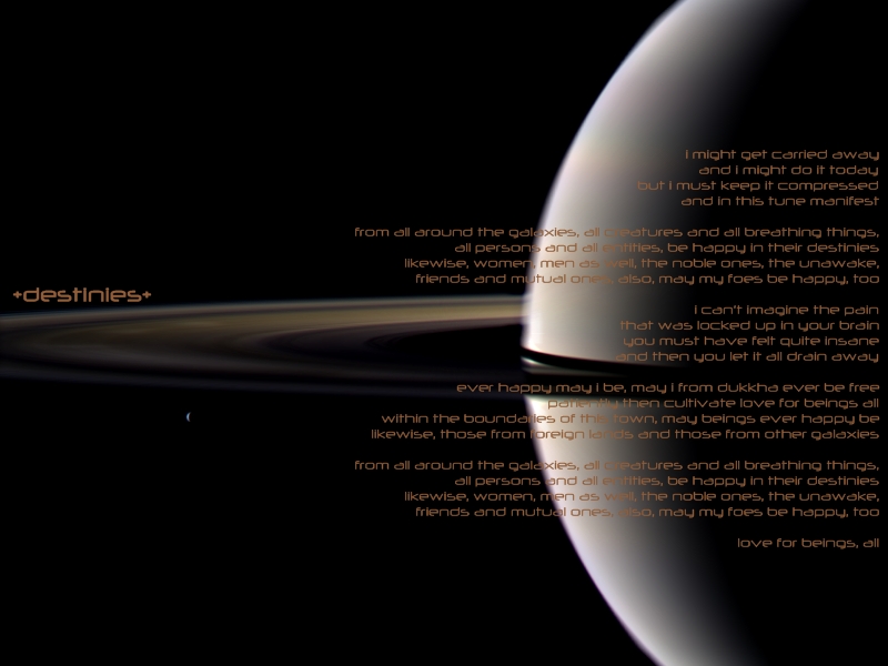 from all around the galaxies, all creatures and all breathing things, all persons and all entities, be happy in their destinies likewise, women, men as well, the noble ones, the unawake, friends and mutual ones, also, may my foes be happy, too