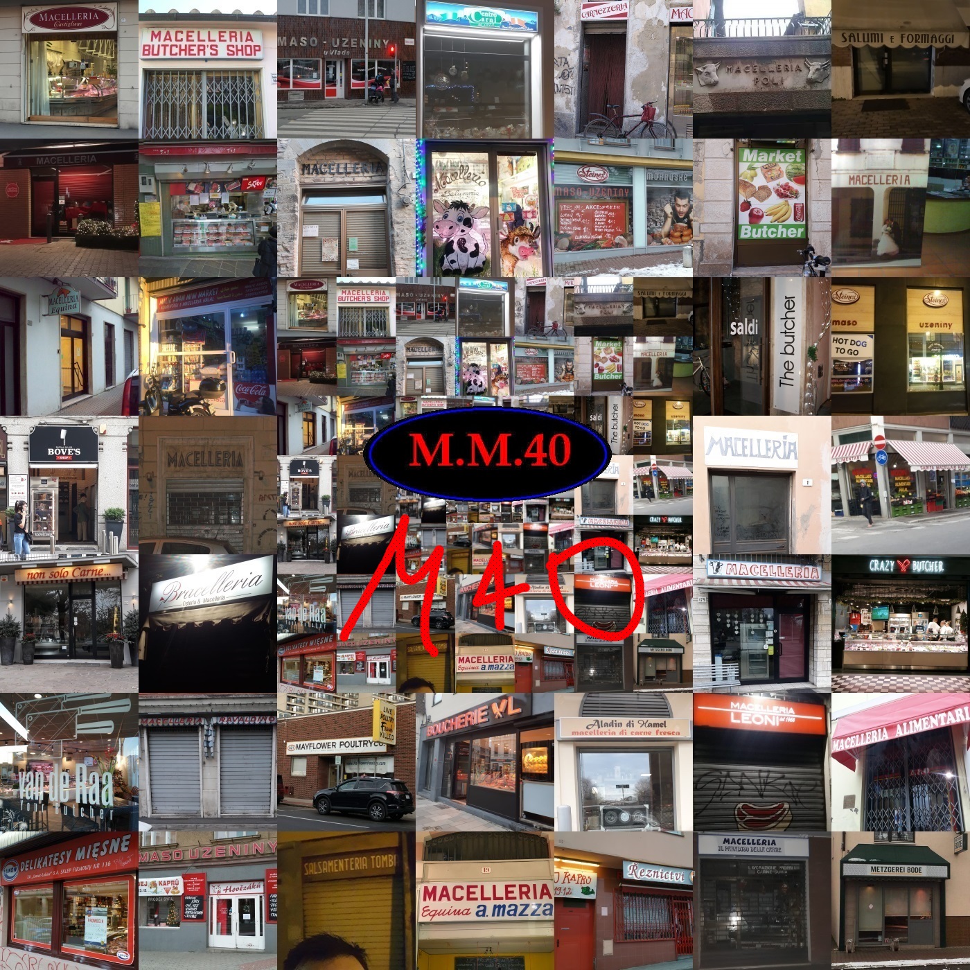 "M40 è il 101esimo album degli MM40. MM40 significa Macelleria a Metri 40. 40M (40 Macellerie, un po’ come CentoVetrine) è un progetto che avevo in mente da anni: una copertina composta da 40 foto di macellerie. Ma scattarle da solo sarebbe stata un’impresa, per cui ho chiesto aiuto a un po’ di amici per completare il puzzle. L’accoglienza è stata incredibile – come per tutte le cose assurde e fondamentalmente inutili, d’altronde: mi sono arrivate macellerie da tutta Italia, nonché da Amsterdam, Brno, Varsavia, Bruxelles, dalla Germania e perfino oltreoceano, da Boston. Pertanto ringrazio, in rigoroso ordine alfabetico: Adamo, Fabio, Francesca, Giorgio, Laura, Livia, Marco, Michele, Provolone, Roberta, Stefanone, Tobia e Veronica: GRAZIE MILLE per i vostri preziosissimi contributi!