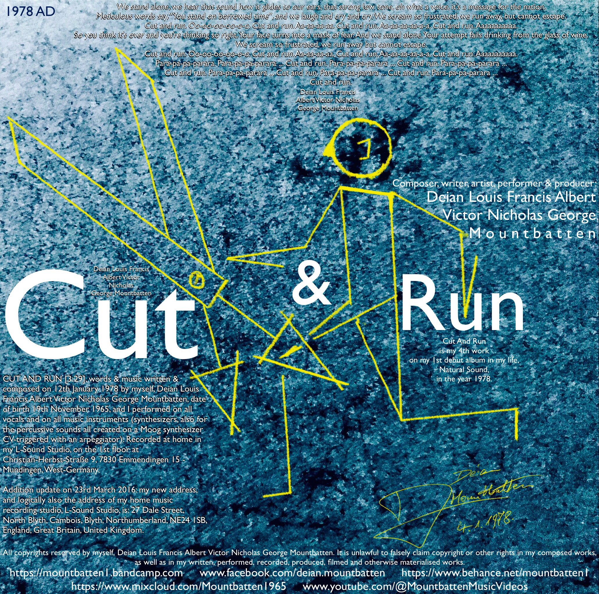 CUT AND RUN [3:29], words & music written & composed on 12th January 1978 by myself, Deian Louis Francis Albert Victor Nicholas George Mountbatten, date of birth 19th November 1965, and I performed on all vocals and on all music instruments (synthesizers, also for the percussive sounds all created on a Moog synthesizer CV-triggered with an arpeggiator). Recorded at home in my L-Sound Studio, on the 1st floor at Christian-Herbst-Straße 9, 7830 Emmendingen 15 - Mundingen, West-Germany.