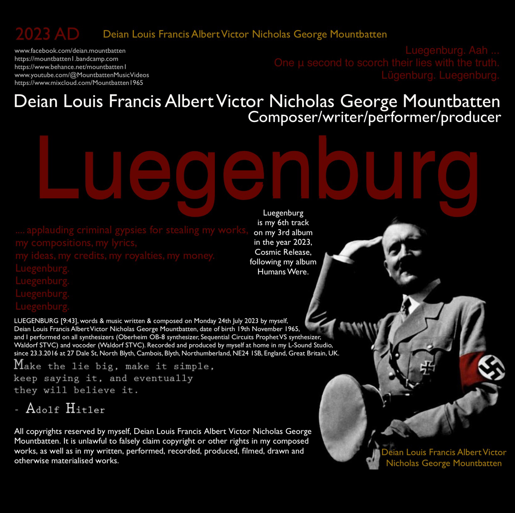 LUEGENBURG [9:43], words & music written & composed on Monday 24th July 2023 by myself, Deian Louis Francis Albert Victor Nicholas George Mountbatten, date of birth 19th November 1965, and I performed on all synthesizers (Oberheim OB-8 synthesizer, Sequential Circuits Prophet VS synthesizer, Waldorf STVC) and vocoder (Waldorf STVC).