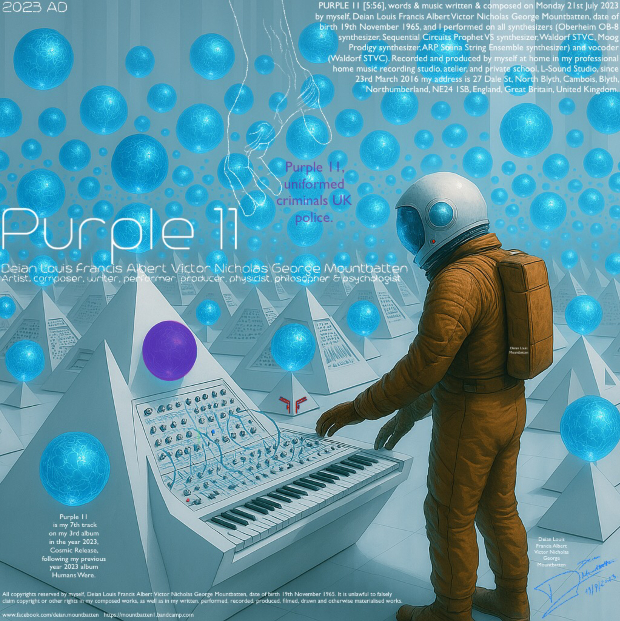PURPLE 11 [5:56], words & music written & composed on Monday 21st July 2023 by myself, Deian Louis Francis Albert Victor Nicholas George Mountbatten, date of birth 19th November 1965, and I performed on all synthesizers (Oberheim OB-8 synthesizer, Sequential Circuits Prophet VS synthesizer, Waldorf STVC, Moog Prodigy synthesizer, ARP Solina String Ensemble synthesizer) and vocoder (Waldorf STVC).
