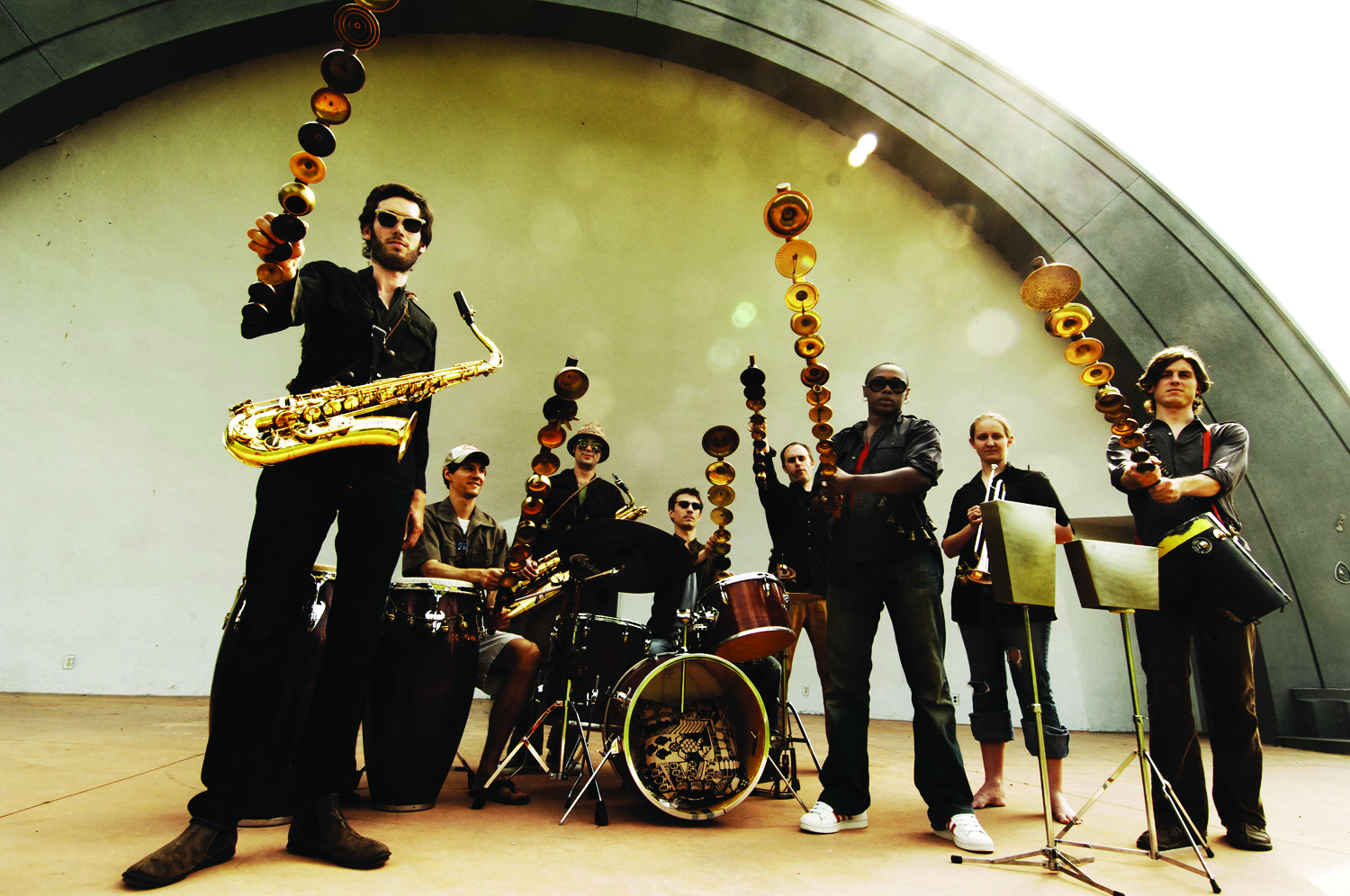 But NOMO is not just a band of thieves, garbage pickers, drifters, jammers, and players. In their soul, NOMO truly is a party band. From their roots, rocking sweaty basement shows in Ann Arbor and Detroit, to their current gig, rocking sweaty basement shows and the occasional jazz festival in Brooklyn, Chicago, New Orleans, London, Sevilla, or Montreal, the band has developed its own form of celebratory dance music. They’ve upped the energy level on recent jaunts and it’s impossible to find a stationary body in the house. This music moves people, and it’s refreshing to see teen hipsters get down with crate diggers, jazz heads nod along with the noise kids at a NOMO show. The band crams three drum sets into the silver Ford Econoline, along with enough electric kalimbas to pull-off all of the two hour marathon sets, plus a few extra to sell to the audience. Horns and guitars fit on top of the amps, and it’s a touring eight-piece-sonic-arsenal that packs a pretty heavy punch.