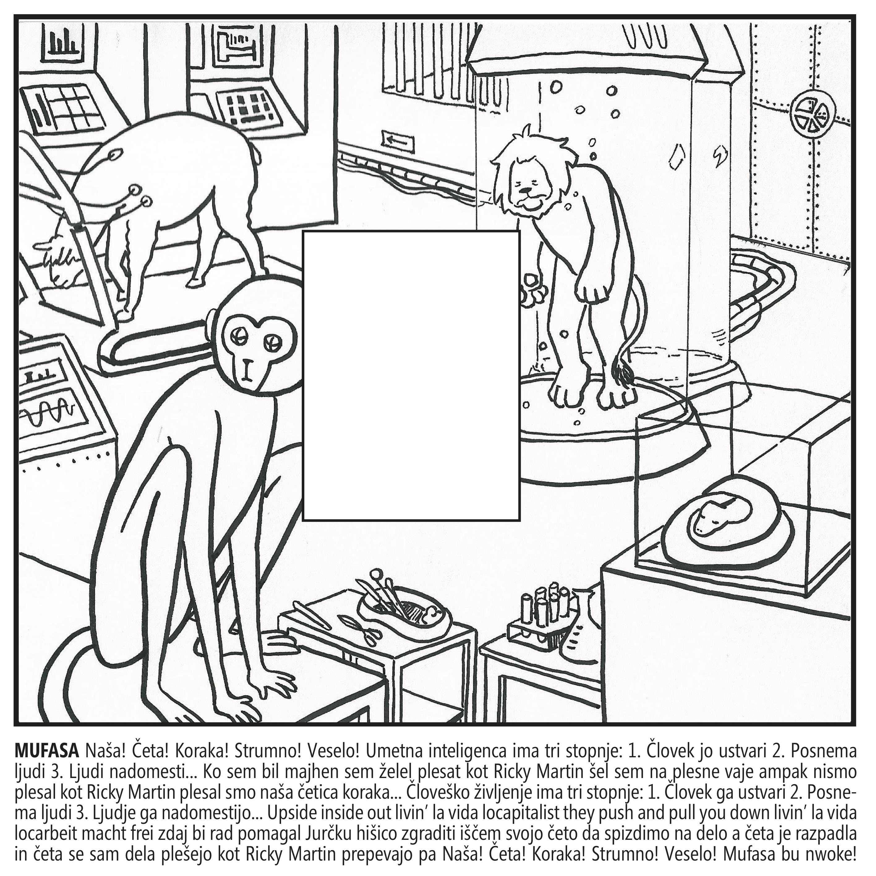 Naša! Četa! Koraka! Strumno! Veselo! Umetna inteligenca ima tri stopnje: 1. Človek jo ustvari 2. Posnema ljudi 3. Ljudi nadomesti... Ko sem bil majhen sem želel plesat kot Ricky Martin šel sem na plesne vaje ampak nismo plesal kot Ricky Martin plesal smo naša četica koraka... Človeško življenje ima tri stopnje: 1. Človek ga ustvari 2. Posnema ljudi 3. Ljudje ga nadomestijo... Upside inside out livin' la vida locapitalist they push and pull you down livin' la vida locarbeit macht frei... Zdaj bi rad pomagal Jurčku hišico zgraditi Iščem svojo četo da spizdimo na delo a četa je razpadla in četa se sam dela plešejo kot Ricky Martin, prepevajo pa Naša! Četa! Koraka! Strumno Veselo! Mufasa bu nwoke!