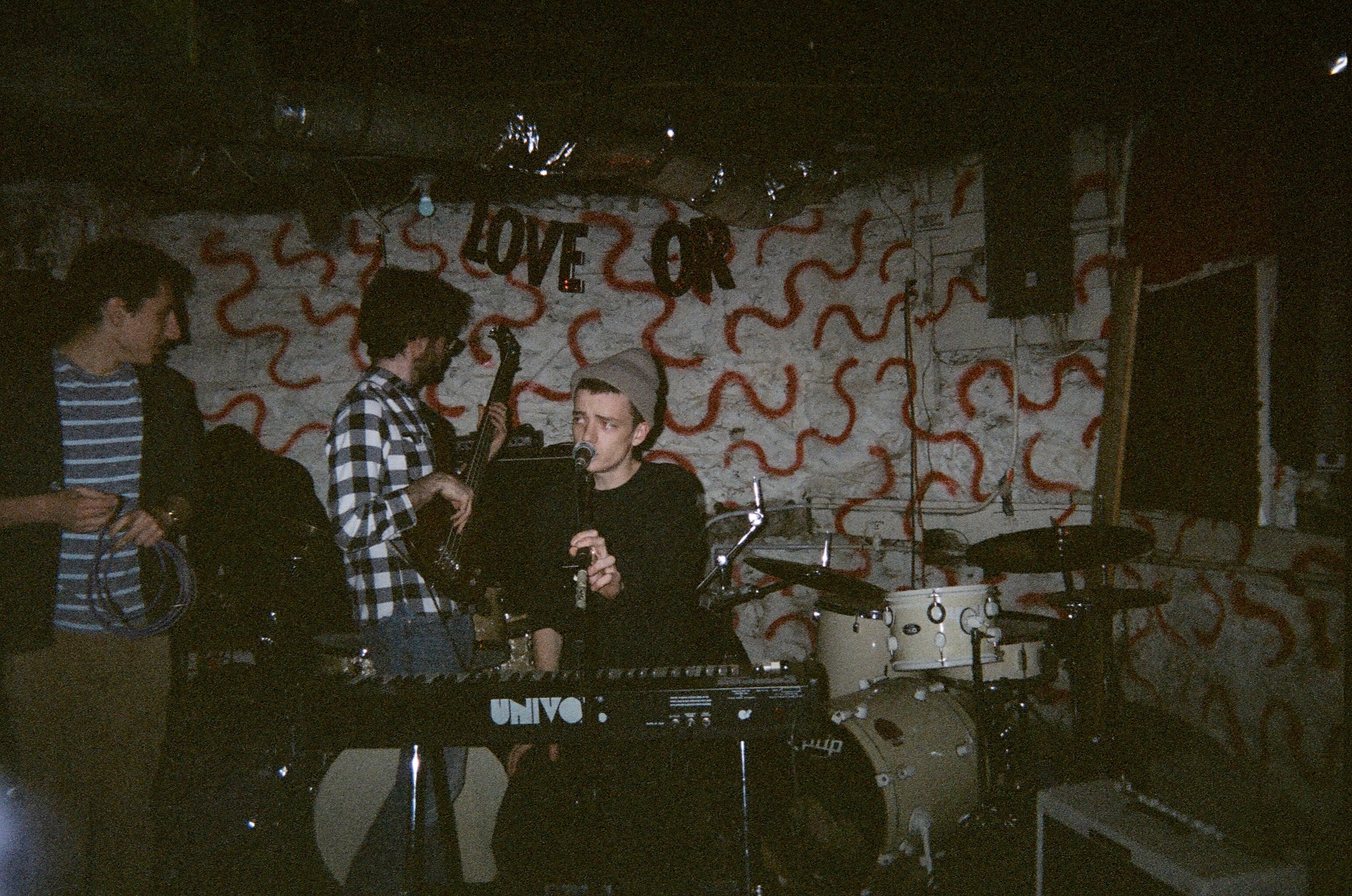 pete sings and plays drums, electric bass, upright bass, electric guitar, acoustic guitar, fender rhodes, univox compac, casiotone 1000p, korg ms-20, tambourine, egg shaker, accordion, talkbox, and midi