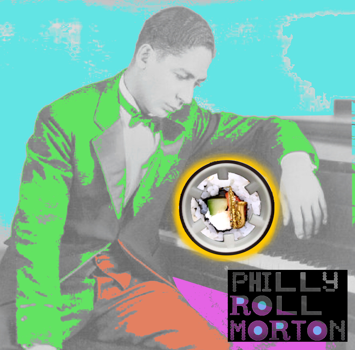 Original photo of Jelly Roll Morton is in the public domain as far as we know. Please contact if otherwise. Photo manipulation/addition/logo by Peter J. Evans