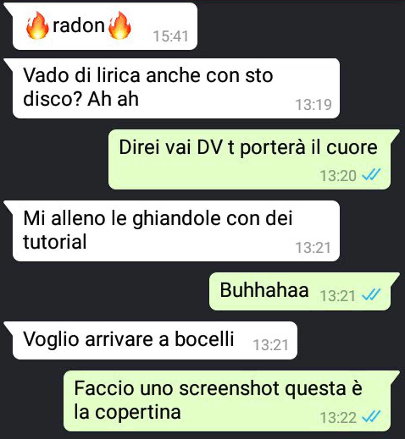 | 5. | E' FORSE CODESTO IL CASO PER IL QUALE TU TOSTO FAI A NOTIFICARE UNA DISFUNZIONE, LA QUALE, PER INGENEROSO CASO, E' PER NOI ASSIOMA, E PERTANTO, TI INVITO, ABBI REVERENZA DELLA SUA QUINTESSENZA O AROMA | 4:08 |
