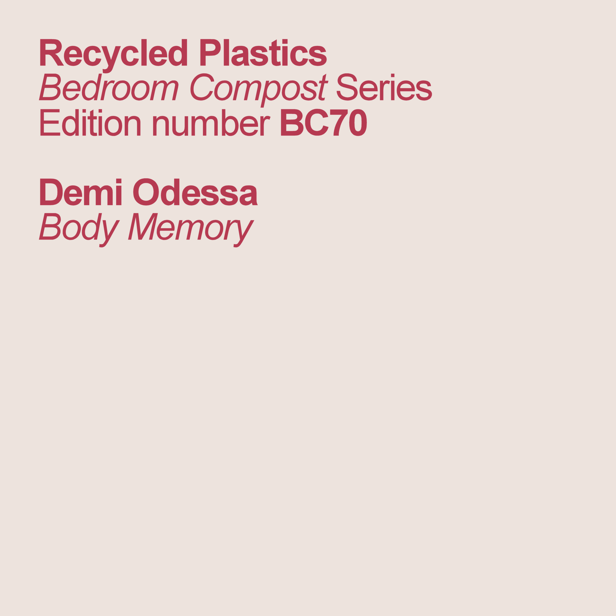W/P by Demi Odessa, except #12: Written by Demi Odessa / Produced & remixed by Milieu. Mastered by The Analog Botanist. Text and design by ABM&D. This is Recycled Plastics number BC70, and 70th in the ongoing Bedroom Compost catalogue.