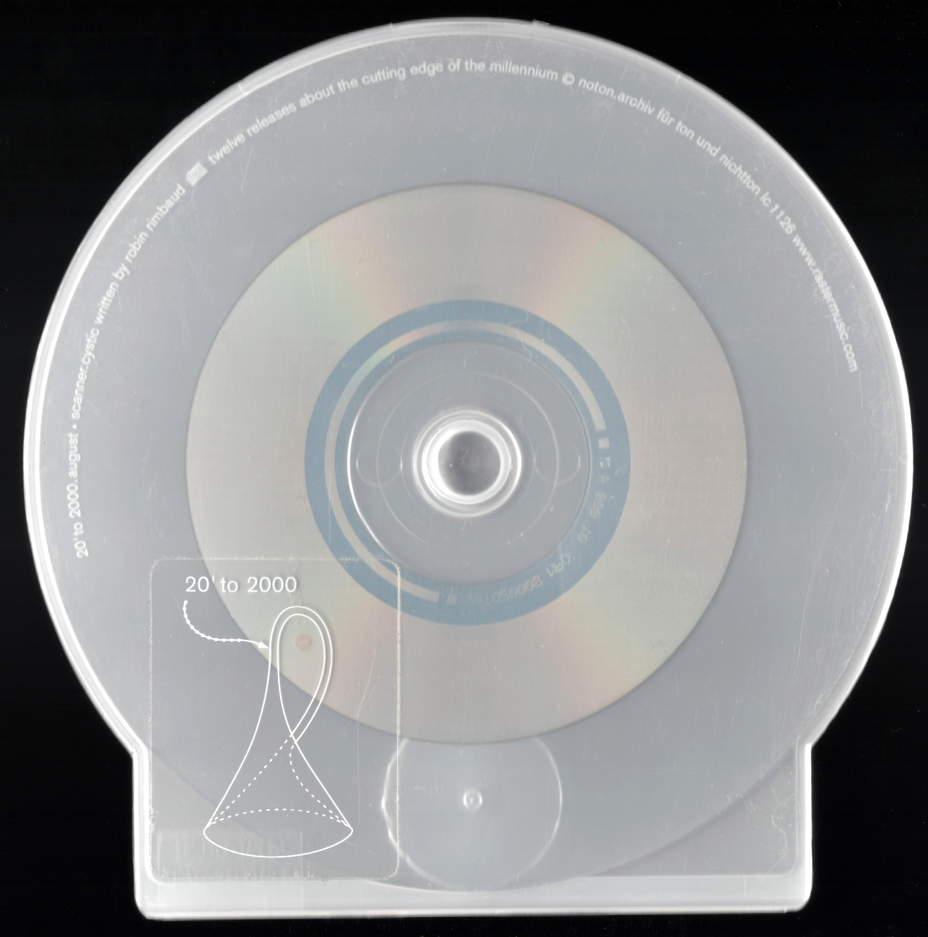 20' to 2000 was released on the German label Raster Noton in 1999. 12 CDs, each featuring 20 minutes of music, showcased work from a different artist every month. The package itself was remarkable, with each CD stored inside a clear scalloped CD Shell, with an extra strong magnet holding the set together. In fact, I remember Carsten Nicolai telling me at the time that the magnets were SO powerful that this proved to be an issue in the post. Separate packages sent in the mail would refuse to part from one another, as the magnetic attraction was so very strong. I can only imagine the post office trying to pull them apart.