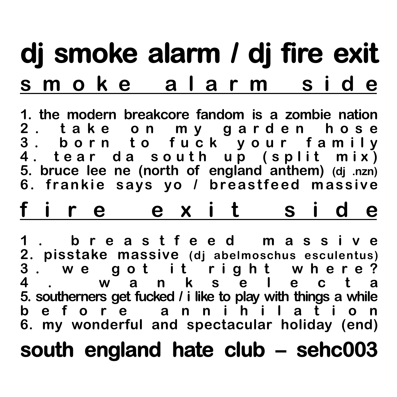 going under their lesser known monikers, dj smoke alarm and dj fire exit, throw some explosive tracks together for this 26 minute split ep. tracks range in age from the end of 2022 to current day, one of fire exit's tracks even being recorded yesterday!