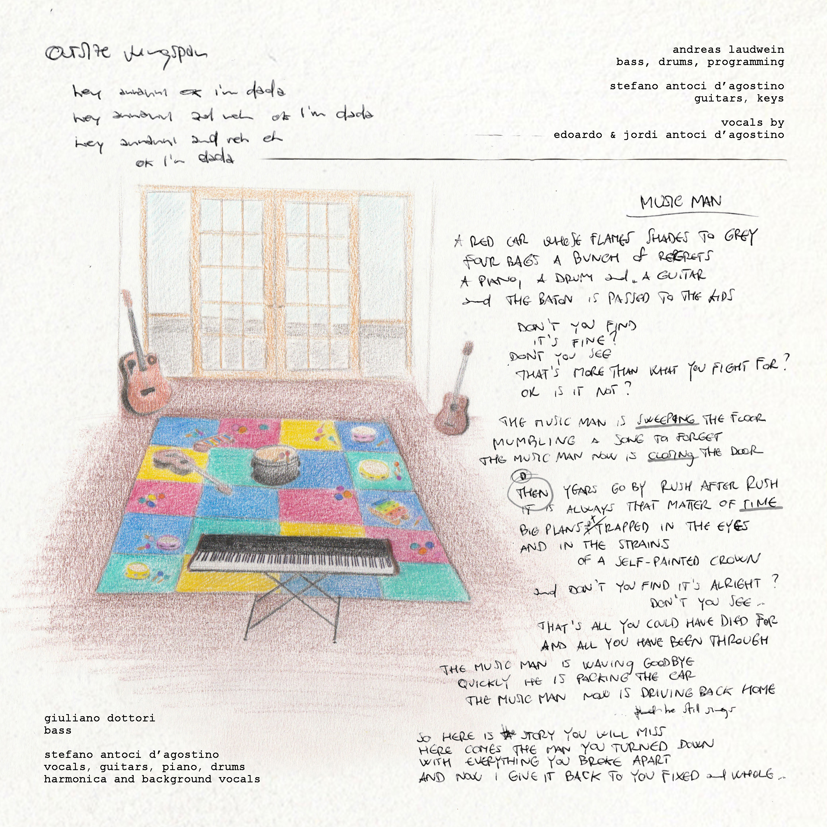 stefano antoci d'agostino: voice, guitars, piano, organ, drums, percussions, harmonica, programming, background vocals and a few more things // giuliano dottori: synth, bass, drums, programming, keys, percussions, additional guitars and some other stuff // francesco saverio gliozzi: cello // additional background vocals on most songs by Andrea Rodini