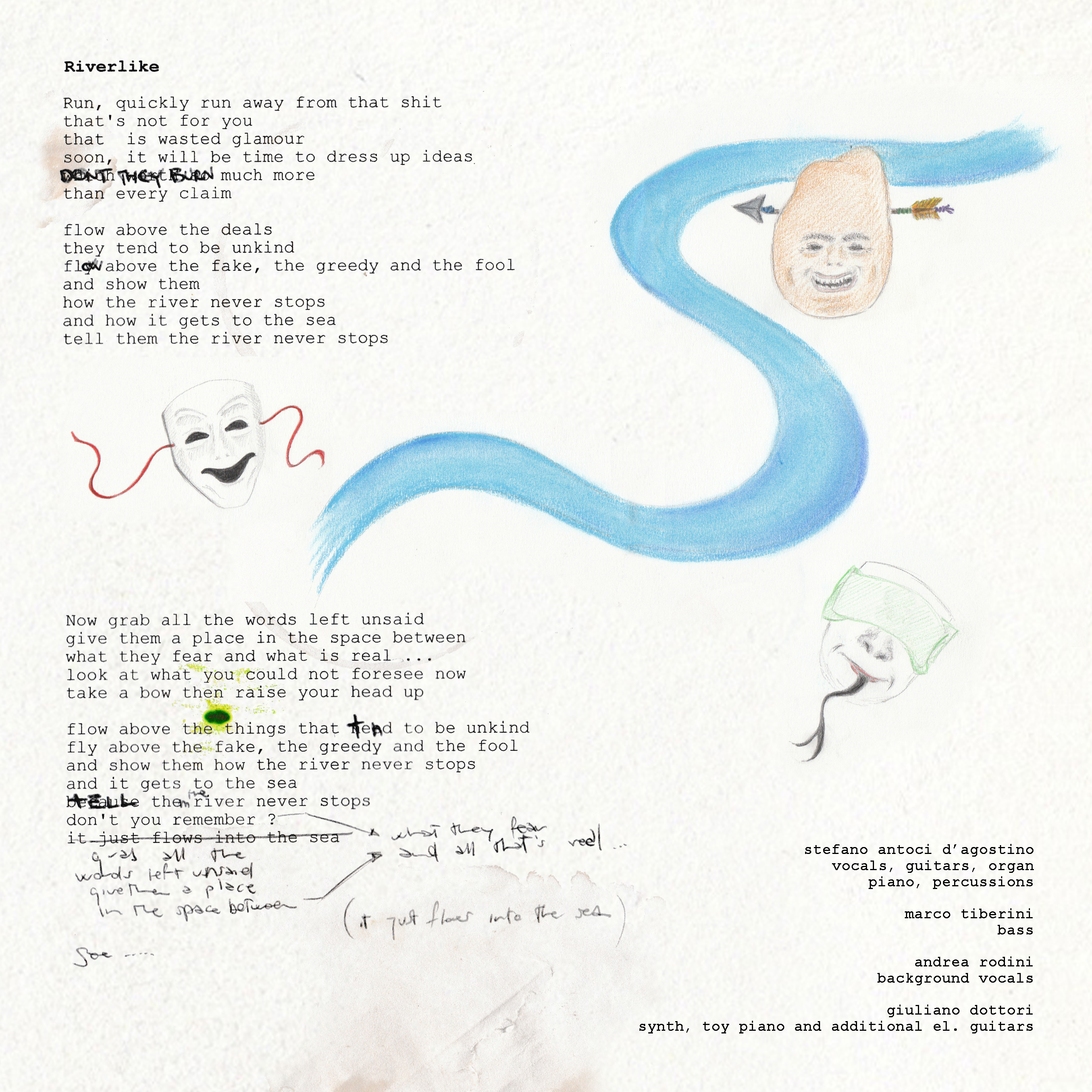 stefano antoci d'agostino: voice, guitars, piano, organ, drums, percussions, harmonica, programming, background vocals and a few more things // giuliano dottori: synth, bass, drums, programming, keys, percussions, additional guitars and some other stuff // francesco saverio gliozzi: cello // additional background vocals on most songs by Andrea Rodini
