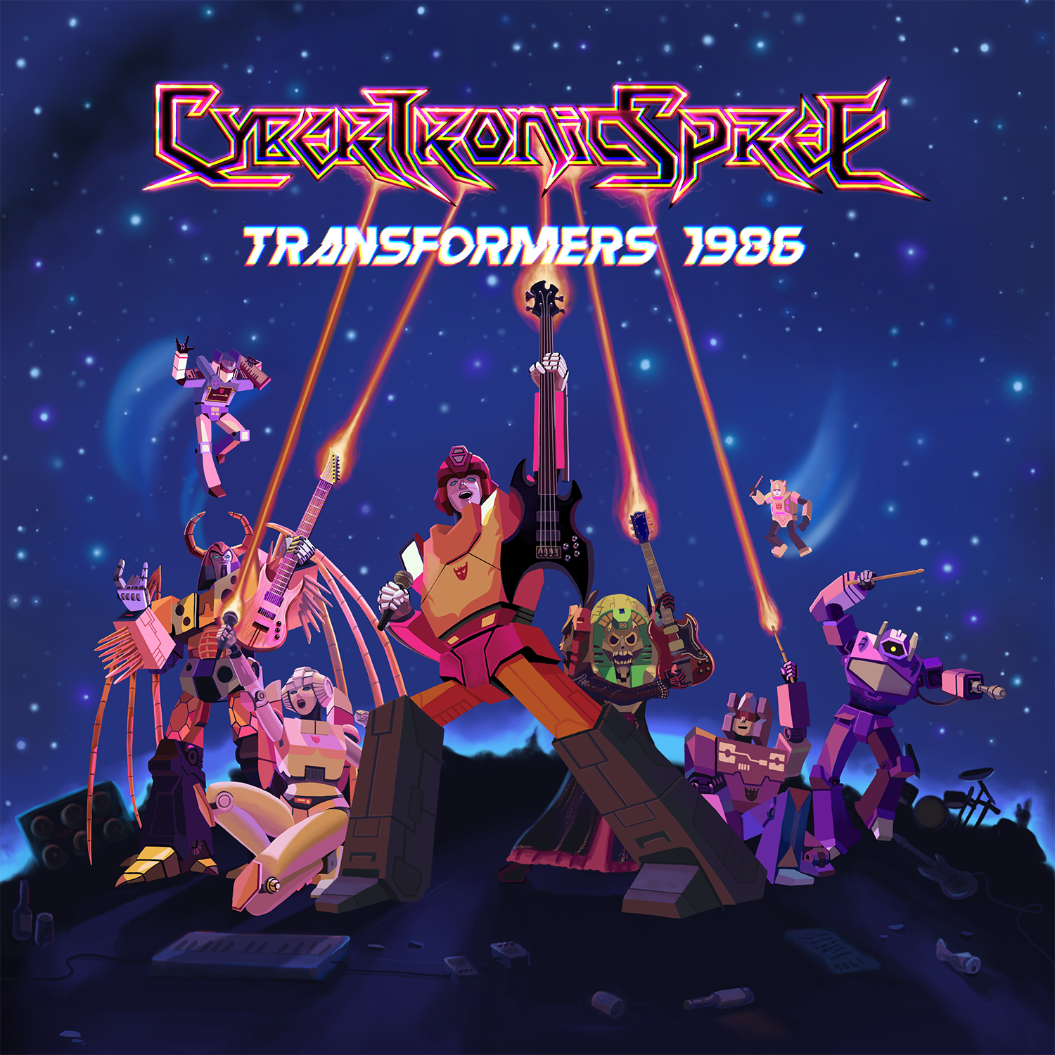 Cybertronic Spree are: Hotrod on lead vocals, backing vocals, bass guitar; Unicron on lead guitars, rhythm guitars; Arcee on lead vocals, backing vocals, lead synthesizers, piano; Quintesson on rhythm guitars, backing vocals, synthesizers; Rumble on drums; Shockwave on drums; Soundwave and Bumblebee on hype; Guest backing vocals by Spike Witwicky.