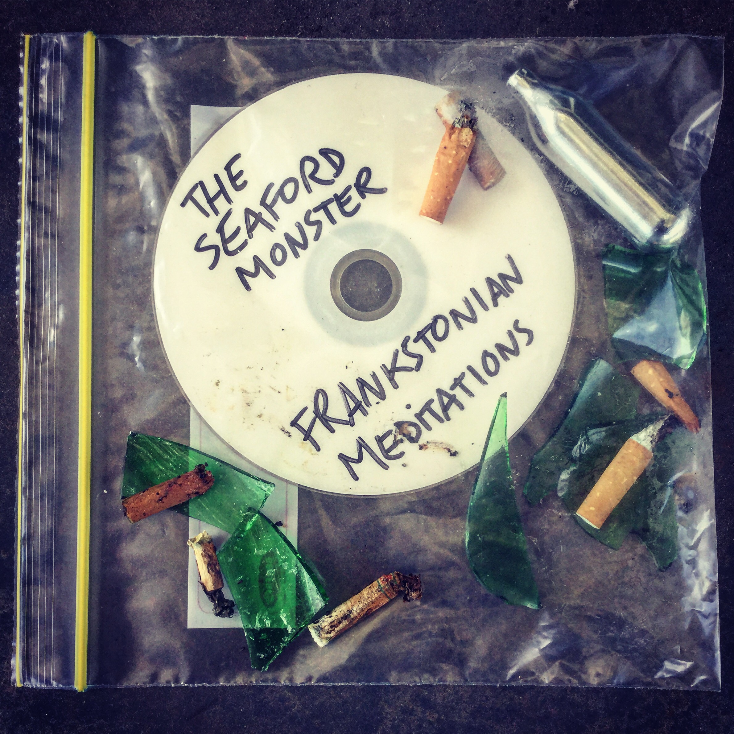 All music featured on FRANKSTONIAN MEDITATIONS was written between 2008 and 2016 by THE SEAFORD MONSTER. Recording, Production, Editing, Mixing and Mastering by Adrian Cappelletti of INURN Productions during November/December 2016. Track 2, 'Lubed with Bin Juice' includes additional vocals by Adrian Cappelletti (Involuntary Convulsion). Track 3, 'Frankstonian Meditations: The Seaford Monster Strikes Back' includes additional vocals by Jordan James (Disentomb). Track 4, 'Ten in the Stink' includes additional vocals by Sam Keene (Incinerated). Track 6, 'Full Thickness (Rectal Prolapse)' includes a guitar solo by Adrian Cappelletti (Involuntary Convulsion). THE SEAFORD MONSTER is: Nick - Vocals Mat - Guitar, Synthesizer Adam - Bass, Vocals Elliott - Drums, Additional Vocals (Tracks 5 & 8)